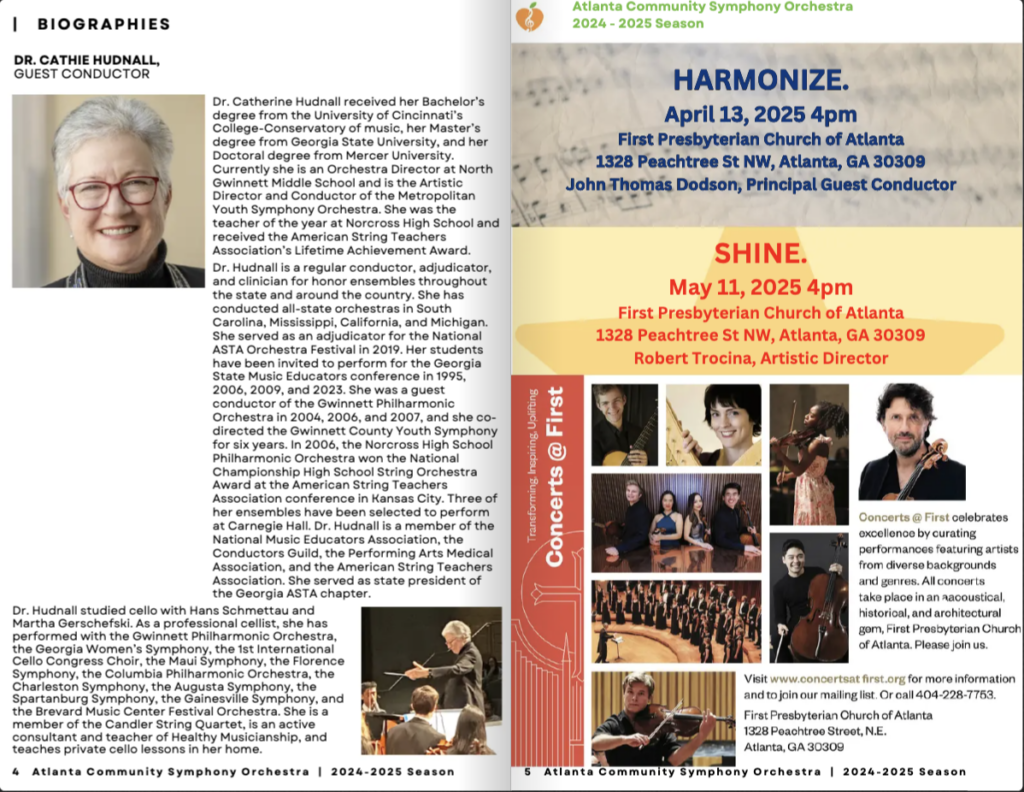 The ACSO distributes concert programs to our audiences. Print advertising allows our sponsors, like you, to share their messages with a larger portion of the greater Atlanta community. We encourage you to please consider purchasing an ad and assisting us with our musical performances and community engagement concerts for the 2025-2026 68th concert season. The ACSO produces professional-quality playbills, in full color, which will be distributed at every concert performance throughout the year.